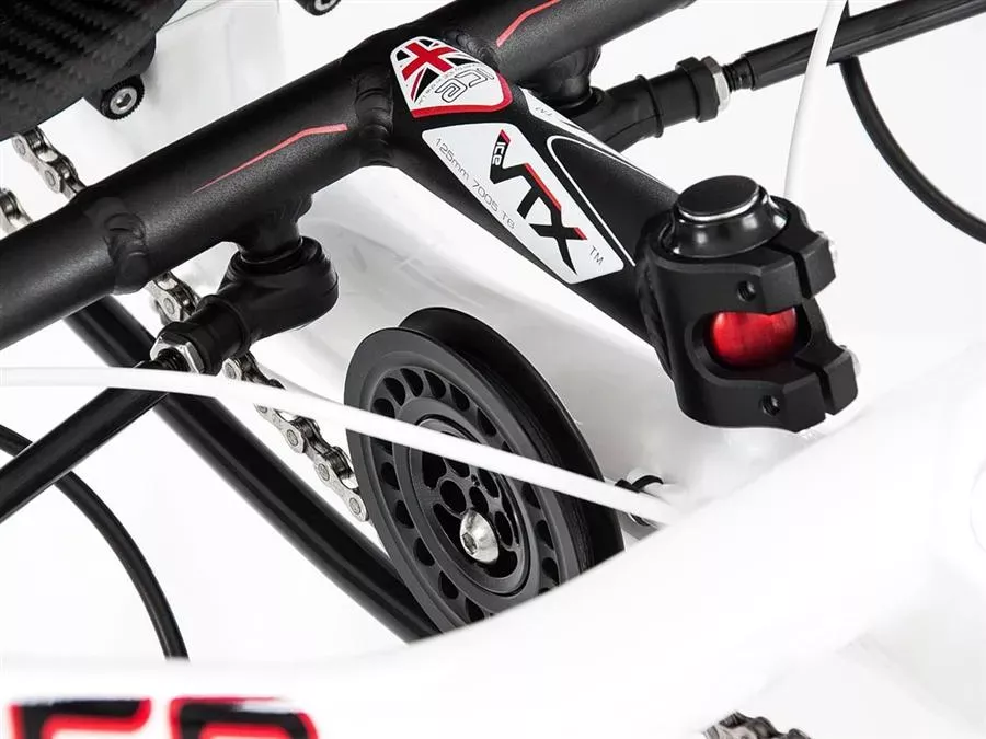 Um das Vortex auch im Flieger oder im Kofferraum mitnehmen zu können, lässt sich sein Rahmen zerlegen. Mit abgenommenen Sitz und eingeschobenen Tretlagerausleger ist der Platzbedarf dann schon erstaunlich gering.