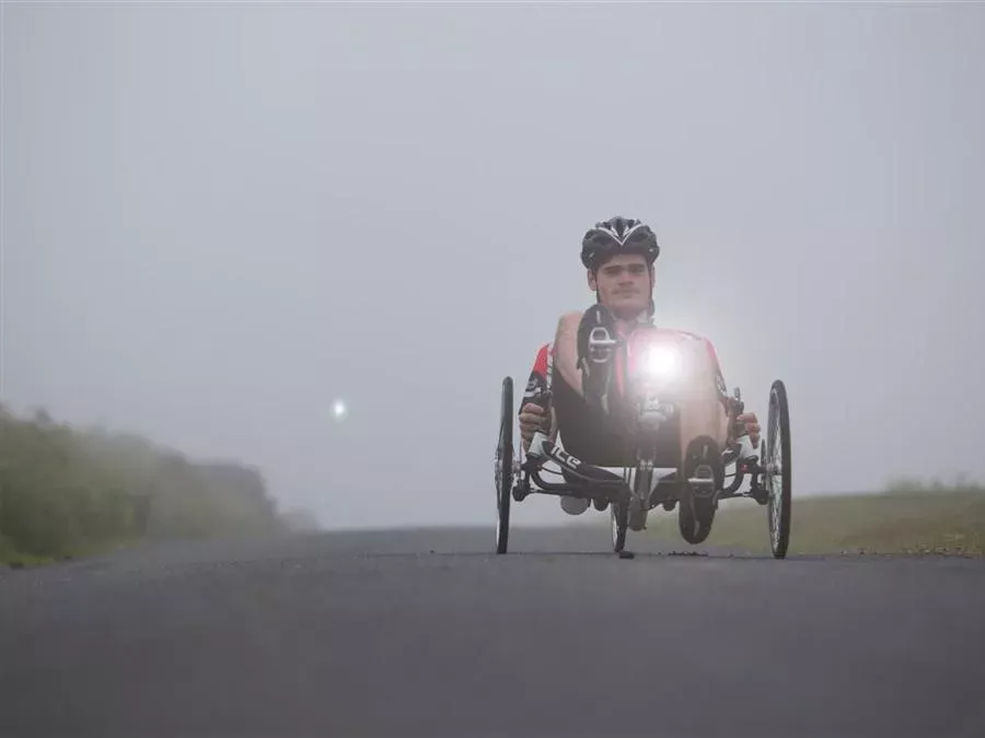 Dieses Trike ist für Wettkämpfe konstruiert und ausgerüstet. Die kleine Spurweite von 70 cm trägt wesentlich zum geringen Luftwiderstand bei.